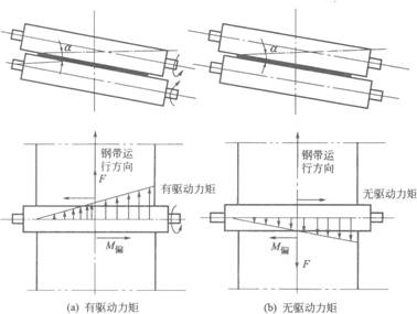 若輥子是帶驅動的,給不銹鋼帶的作用力是向前的動力,則不銹鋼帶所受到的向前的動力的合力偏向不銹鋼帶被夾緊的一端,會產生一個使不銹鋼帶向這一方向偏移的力偶M偏,所以不銹鋼帶是向著壓力大、輥子開口小的一端偏移。若輥子是從動的,給不銹鋼帶的作用力是向后的阻力,則會使不銹鋼帶向壓力小、輥子開口大的一端偏移。